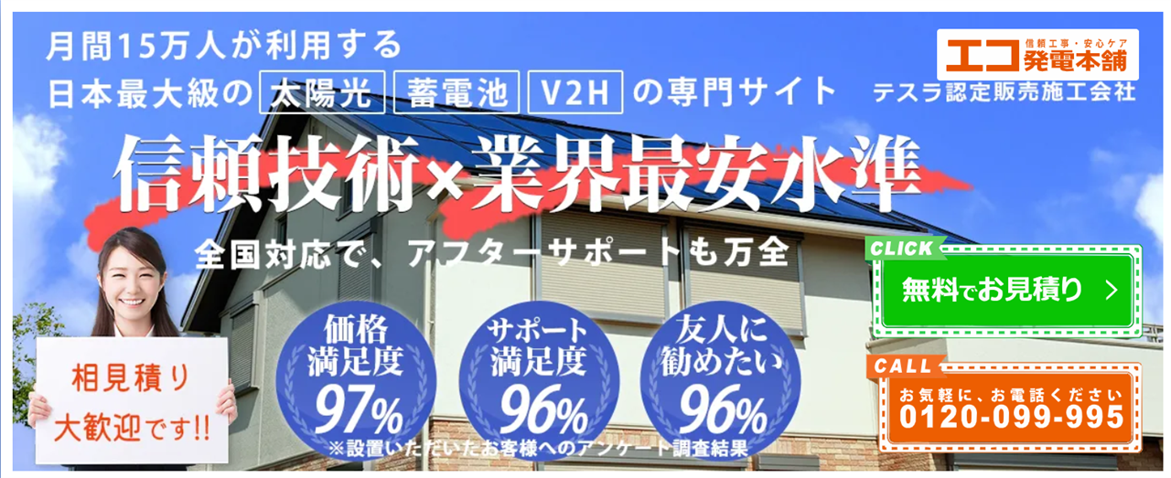 特に、補助金申請の承認率は100%の実績を誇り、電気工事申請費用を含め申請代行を無料で行ってくれる点が大きな強みです。商社として海外メーカーから直接・大量仕入れを行うことで、中間マージンを削減し、業界最安水準での提供を実現しています。また、自社に電気工事士が在籍し、現地調査から施工、アフターフォローまで一貫して対応するため、長期的な安心感が得られます。尚、見積り依頼は最短30秒で完了します。