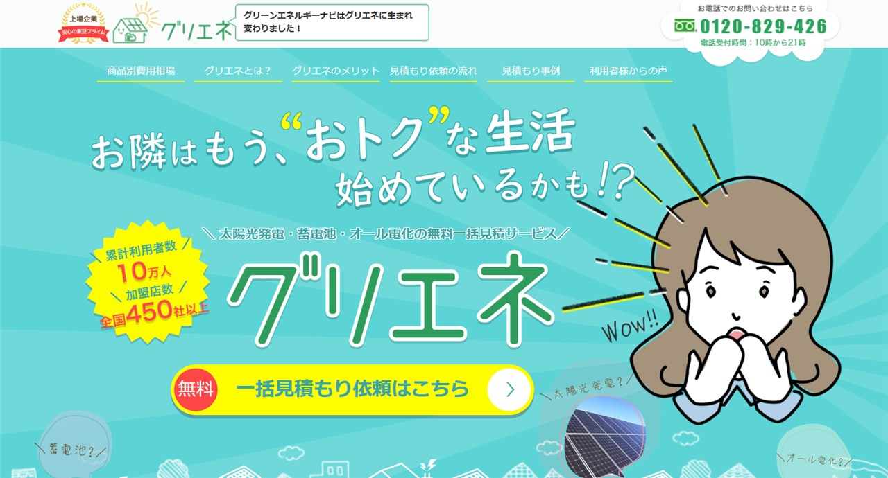 グリエネは、蓄電池設置業者を比較検討できる完全無料の一括見積もりサイトです。厳選された210社以上の登録業者から最大5社の見積もりを一括で取得できます。