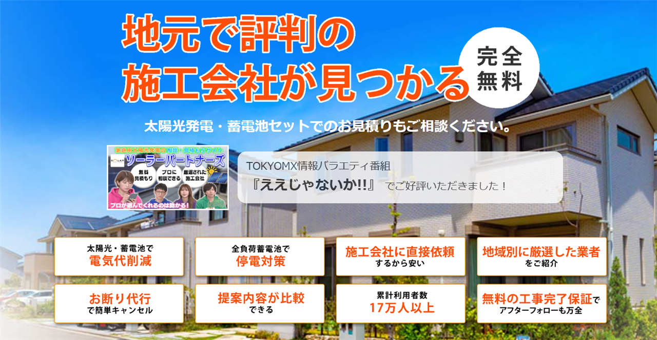 特に、補助金申請の承認率は100%の実績を誇り、電気工事申請費用を含め申請代行を無料で行ってくれる点が大きな強みです。商社として海外メーカーから直接・大量仕入れを行うことで、中間マージンを削減し、業界最安水準での提供を実現しています。また、自社に電気工事士が在籍し、現地調査から施工、アフターフォローまで一貫して対応するため、長期的な安心感が得られます。尚、見積り依頼は最短30秒で完了します。